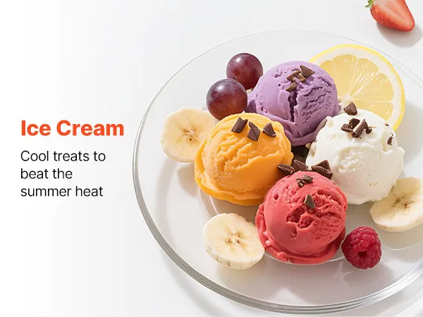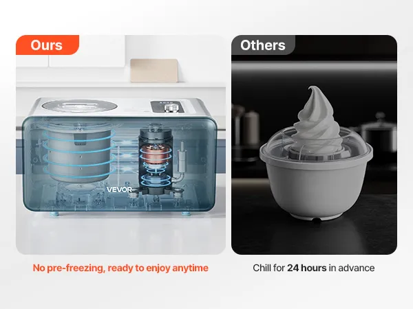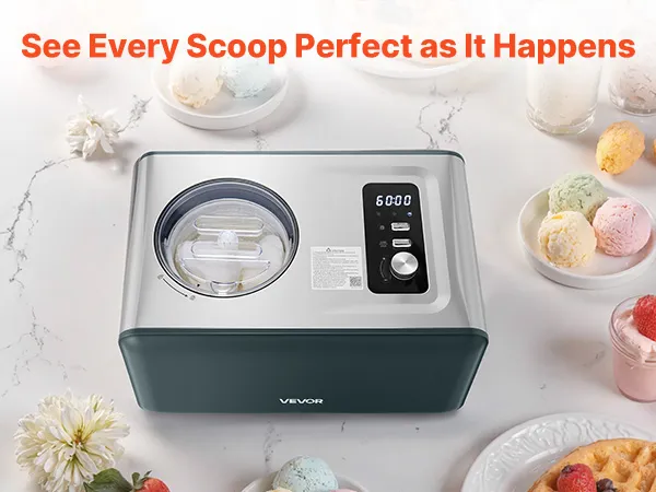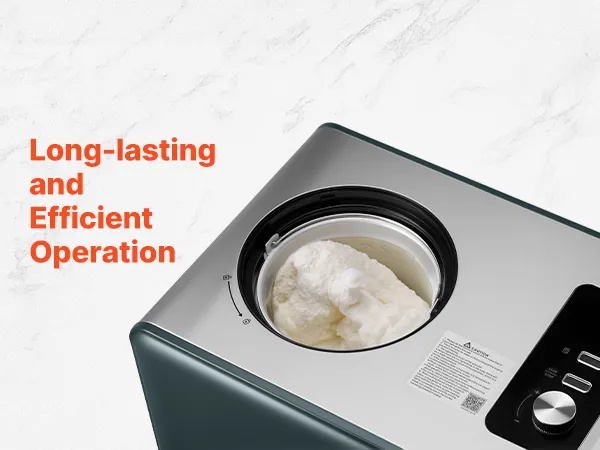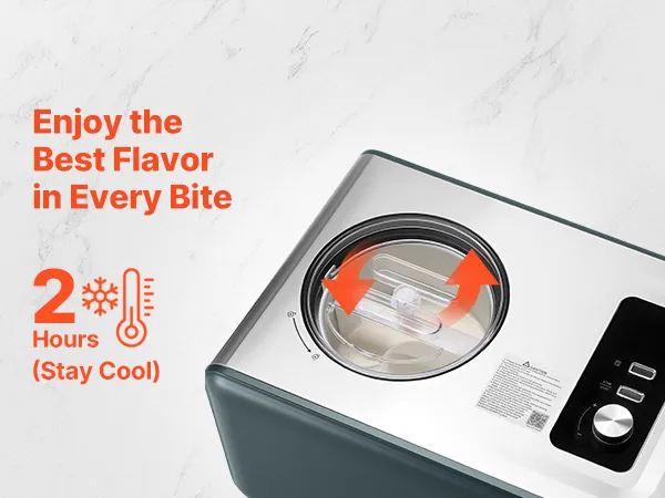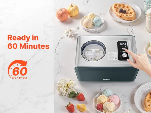 Built-in Compressor: The powerful ice cream maker with built-in compressor makes ice cream in just 50-60 minutes. No need to pre-freeze the bowl—just add your ingredients and watch it quickly turn into delicious homemade ice cream