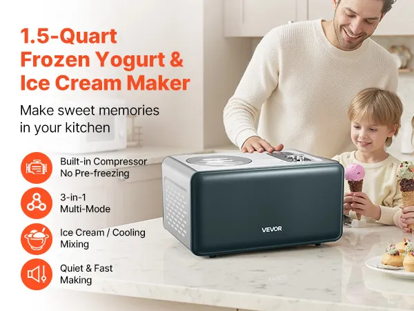 This 1.5-quart frozen yogurt & ice cream maker lets you effortlessly create sweet memories in your kitchen. With no pre-freezing required and four mode options to choose from, enjoy quick, silent ice cream making and delightful moments with your family.
