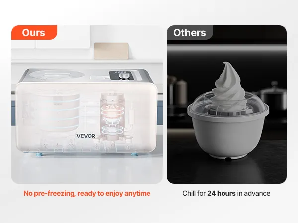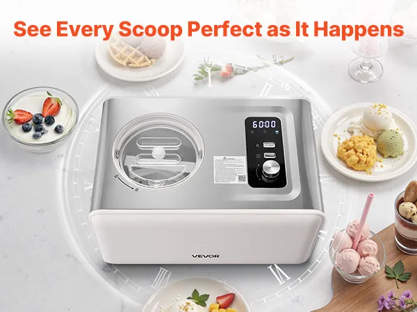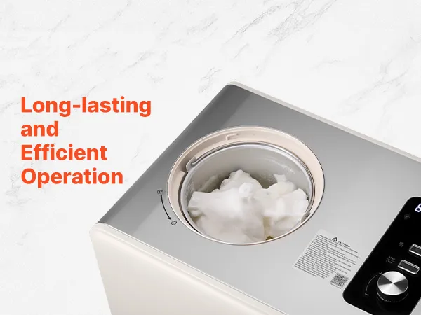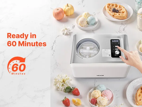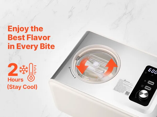 Built-in Compressor: The powerful ice cream maker with built-in compressor makes ice cream in just 50-60 minutes. No need to pre-freeze the bowl—just add your ingredients and watch it quickly turn into delicious homemade ice cream