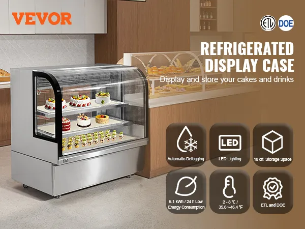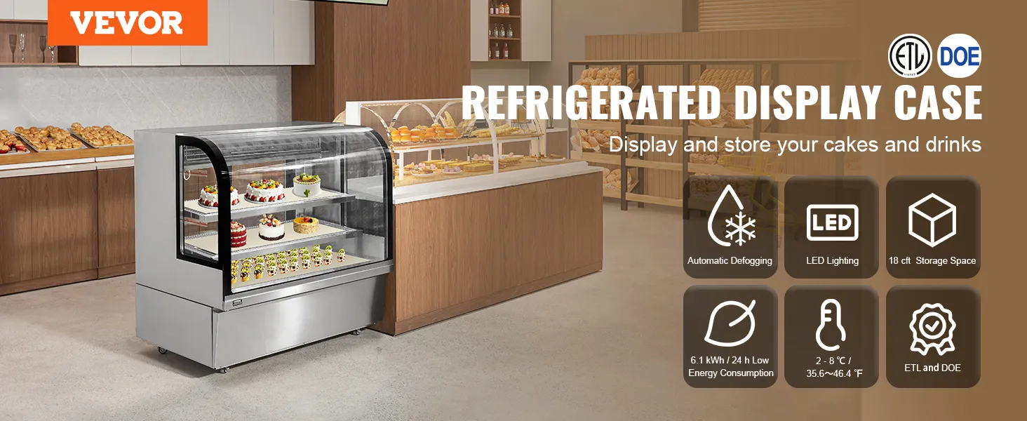 Denna böjda kylmonter har ett infällt direktkylningssystem som snabbt kyler ner till inställd temperatur. Med en automatisk avimningsfunktion, LED-belysning och högtransparent härdat glas visar den upp dina maträtter på ett vackert sätt, vilket gör den idealisk för dina kommersiella miljöer.