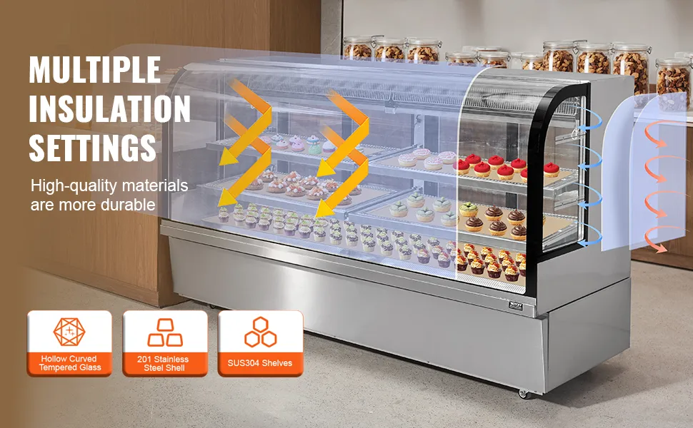 Quick Cooling: The refrigerated display case features a recessed direct cooling system that rapidly cools to the set temperature (temperature range: 2 - 8°C / 35.6 - 46.4°F). It efficiently keeps the internal temperature within the designated range, ensuring your food stays in the best condition while saving energy.