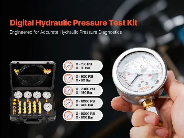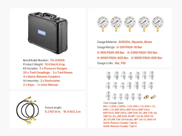 Complete Hydraulic Pressure Test Kit: This kit covers five pressure ranges (10/60/160/400/600 Bar). It includes five gauges, twenty couplings, four quick couplers, and three hoses. It is designed for low, medium, and high-pressure hydraulic systems
