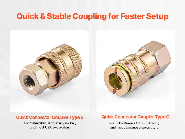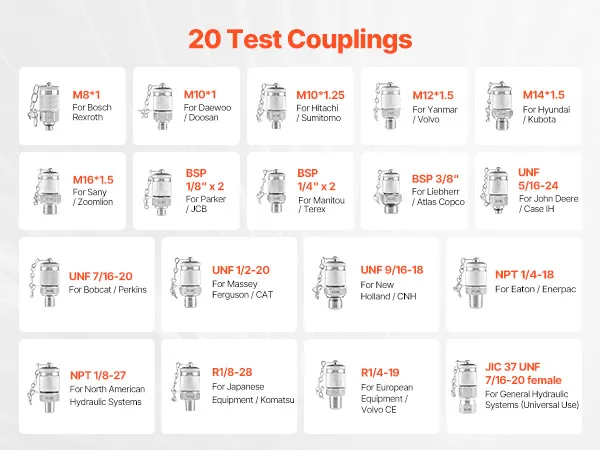 Wide Compatibility: This hydraulic pressure gauge kit covers G, M, UNF, and NPT thread types and includes Type B and Type C quick connectors for multiple hydraulic systems. The flexible hose easily extends into narrow or hard-to-reach testing points