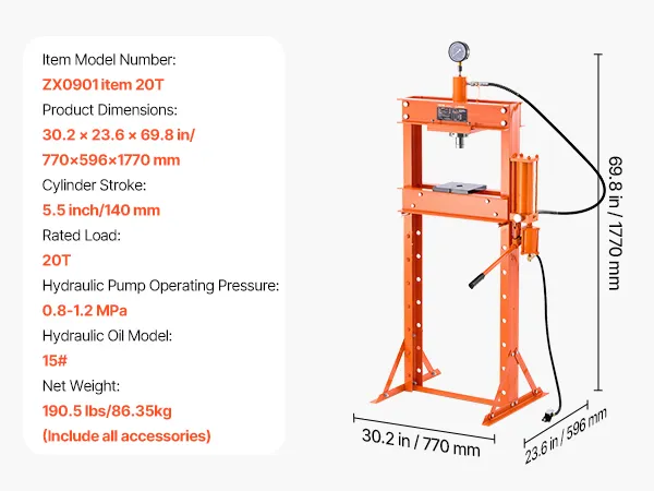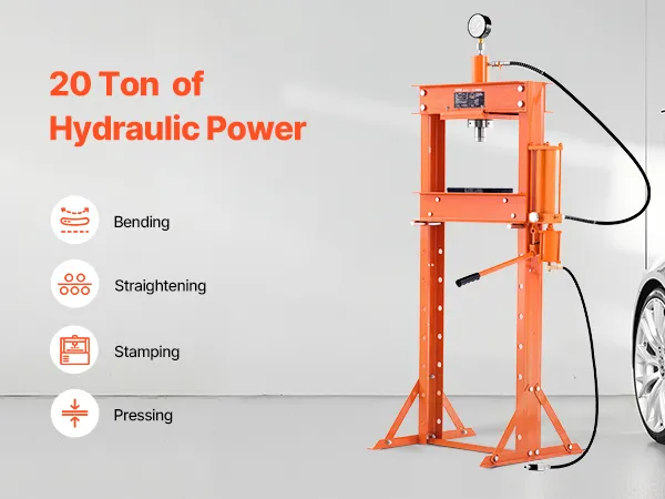 20 Ton Strong Load Capacity: Our hydraulic press helps you easily disassemble and install automotive bushings, ball joints, U-joints, and more, as well as straighten, bend, and stamp metal parts. Whether you're a professional or a DIY car repair enthusiast, it allows for quick and simple operation.