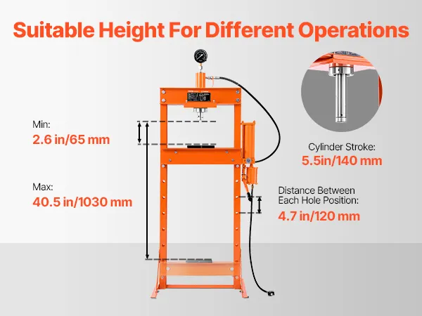 Adjustable Height: The hydraulic shop press’s worktable features a quick-adjust pin system with 9 height settings, ranging from 2.6 to 40.5 inches (65-1030 mm), providing flexible working positions. The cylinder stroke is 5.5 inches (140 mm). Note: Exceeding the cylinder stroke range may cause damage to the cylinder seals.