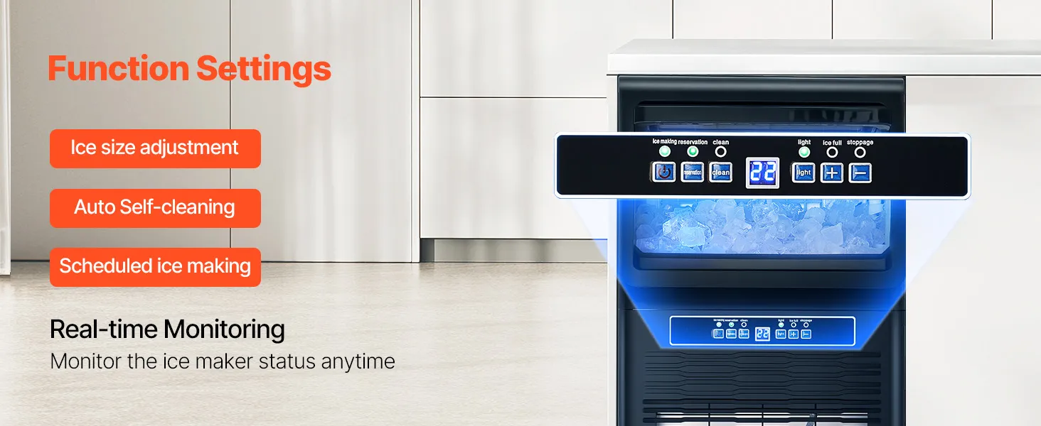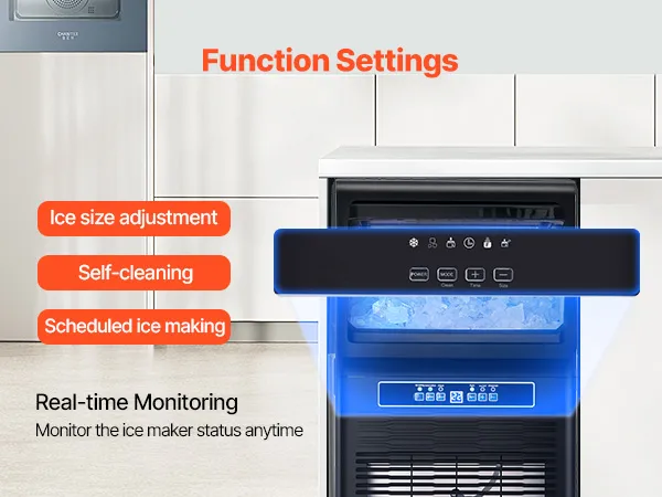 Smart Control Panel: Our commercial ice maker features an LED digital display and mechanical buttons, giving you precise control over the ice-making process. Adjust ice thickness by increasing or decreasing ice-making time effortlessly. And that's not all - it also comes with a one-touch automatic cleaning function, making machine maintenance a breeze. You can monitor the status of the ice maker in real-time with the indicator light on the panel