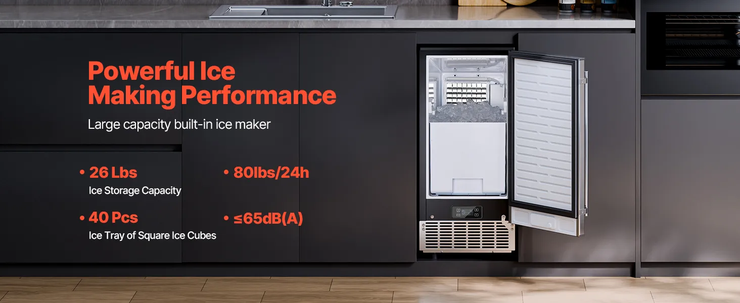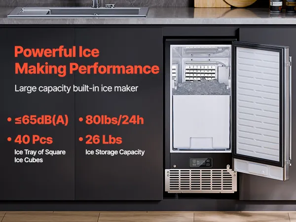 Tento výkonný vestavný výrobník ledu pod kuchyňskou linku dokáže vyrobit 80 liber čtvercových kostek ledu (0,87 x 0,87 x 0,87 palce) denně, přičemž led je připraven za pouhých 15 minut. Košík na led má kapacitu 26 liber, což zajišťuje stálý přísun ledu pro uspokojení vašich potřeb.