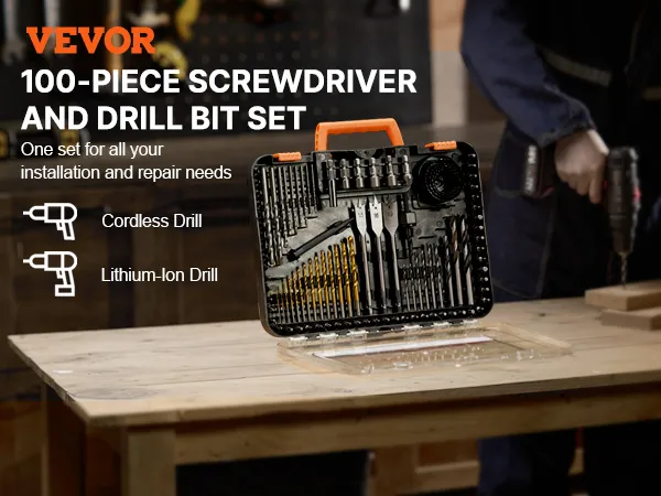 Sada vrtáků VEVOR, 100dílná sada vrtáků a šroubováků, sada šroubováků vhodná pro vrtání a šroubování do dřeva, kovu, cementu, sady vrtáků v kombinovaném kufříku