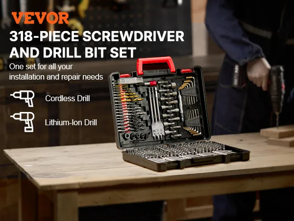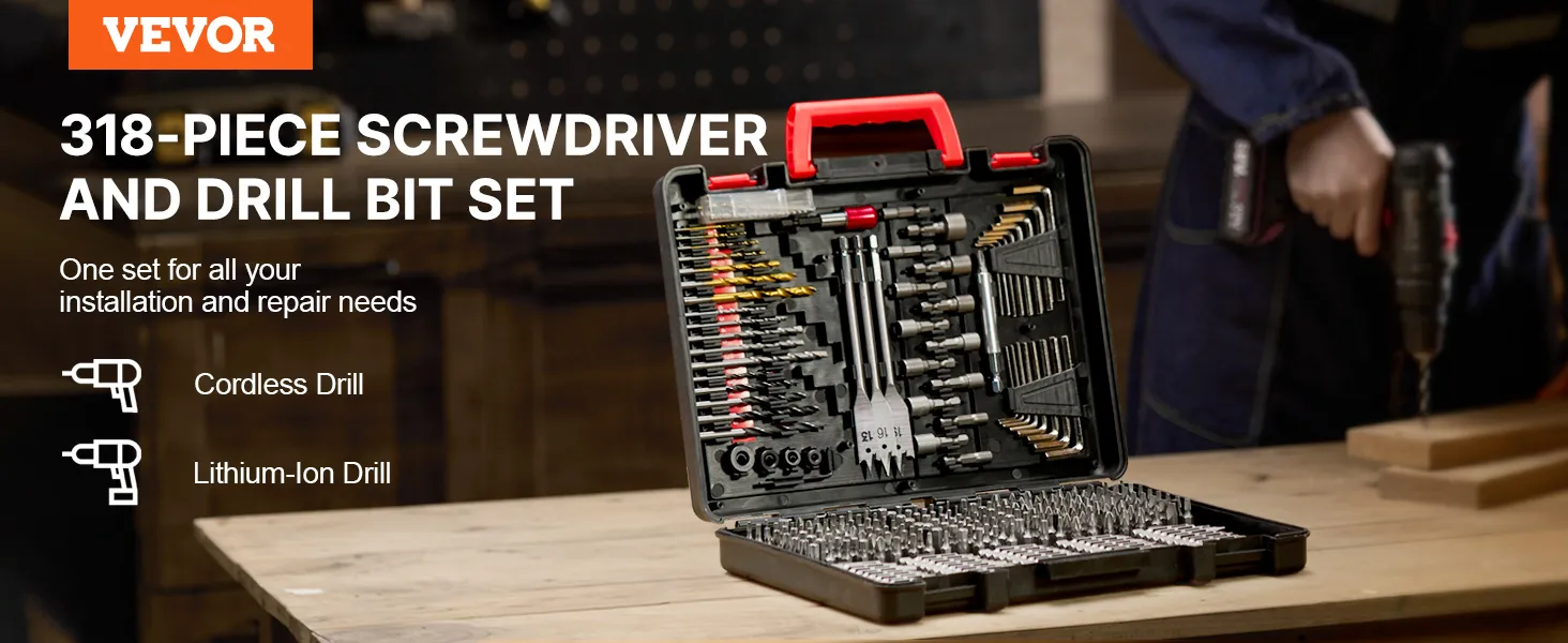 Sada vrtáků VEVOR, 318dílná sada vrtáků a šroubováků, sada šroubováků vhodná pro vrtání a šroubování do dřeva, kovu, cementu, sady vrtáků v kombinované sadě v uspořádaném přepravním pouzdře.