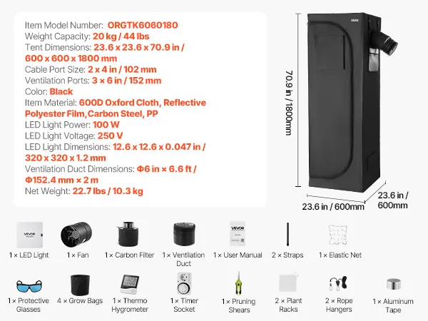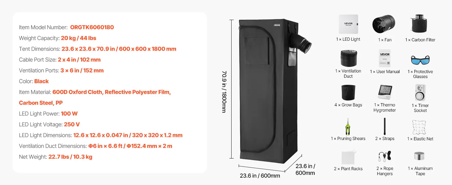 Complete Grow Tent Kit: A comprehensive set that's ideal for beginners to get started quickly. Includes an LED grow light, duct fan, ventilation hose, carbon filter, timer, temperature and humidity gauge, along with plant bags, scissors, glasses, and other accessories. The indoor grow tent is designed with efficient cable and duct management for easy setup