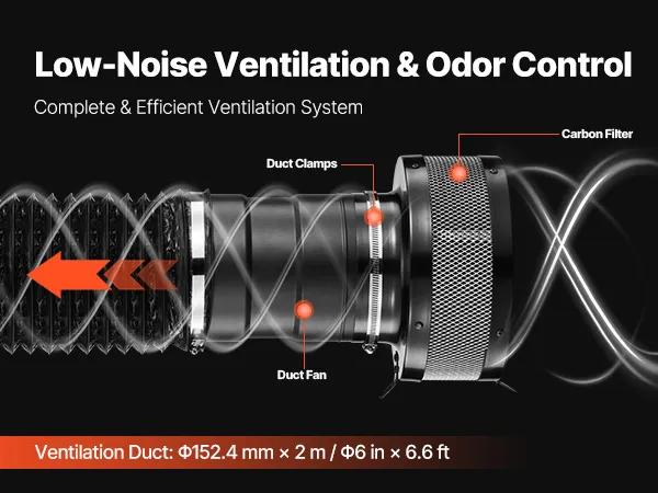 Efficient Ventilation System: Featuring a large-diameter duct fan with an airflow of 452 m³/h and low noise operation. Paired with a carbon filter and a 2-meter flexible exhaust pipe, our grow tent for indoor plants ensures proper ventilation, filters out dust, and eliminates odors, keeping the tent's environment optimal for plant health