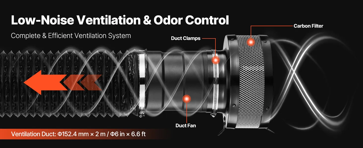 The complete ducting system effective achieves proper airflow and rapid moisture removal but also purifies odors released by the plants, creating a stable and clean growing environment. With low operational noise, it's suitable for use at home.