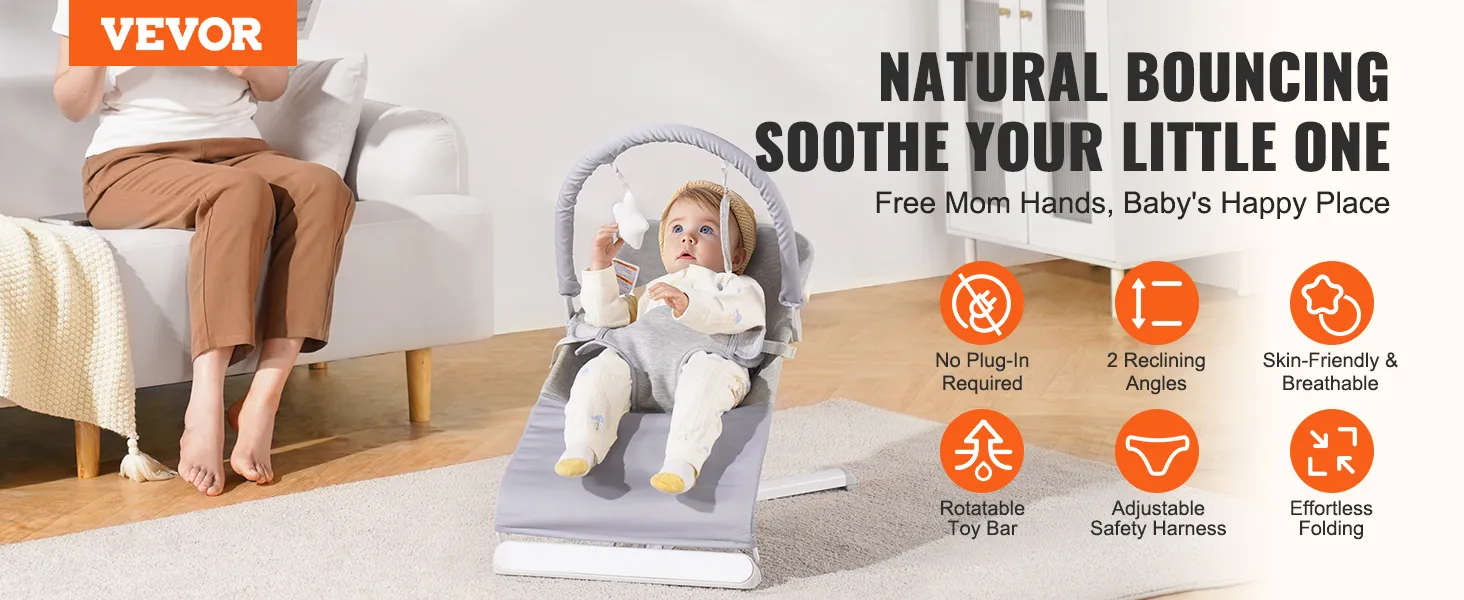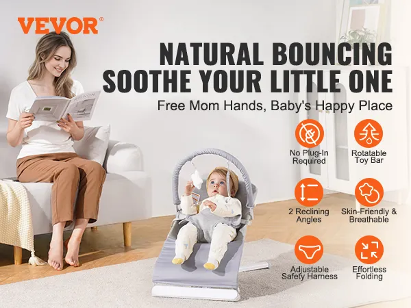 Jemné poskakování, šťastná miminka: Přirozené poskakování, není potřeba žádné zapojení do zásuvky! Dětské poskakovací lehátko VEVOR je vybaveno tříbodovým bezpečnostním pásem a stereoskopickým ovíjením, které poskytuje jemné a bezpečné houpání. Uklidňující poskakovací pohyby napodobují teplo maminčina lůna, takže vaše miminka klidně spí a šťastně si hrají. (Vhodné pro miminka ve věku 0-9 měsíců, maximální nosnost: 9 kg)
