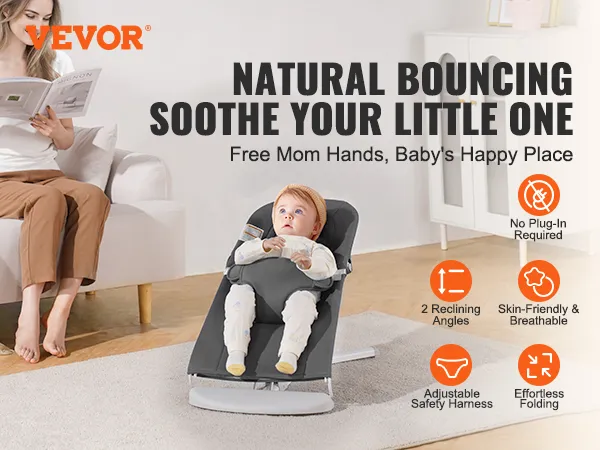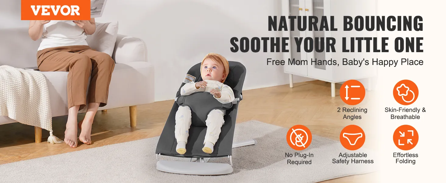 Jemné poskakování, šťastná miminka: Přirozené poskakování, není potřeba žádné zapojení do zásuvky! Dětské poskakovací lehátko VEVOR je vybaveno tříbodovým bezpečnostním pásem a stereoskopickým ovíjením, které poskytuje jemné a bezpečné houpání. Uklidňující poskakovací pohyby napodobují teplo maminčina lůna, takže vaše miminka klidně spí a šťastně si hrají. (Vhodné pro miminka ve věku 0-9 měsíců, maximální nosnost: 9 kg)