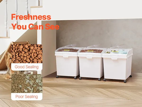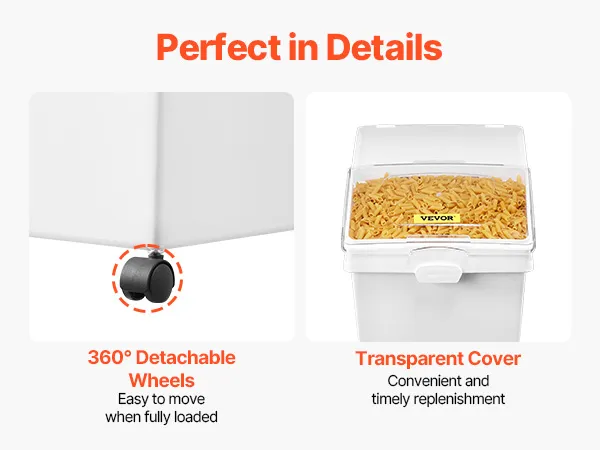 360° kääntyvien irrotettavien pyörien ansiosta tämä lemmikkien ruokasäiliö on helppo liikutella, jopa täyteen lastattuna. Kuljetatpa sitten raskasta lemmikkien ruokaa tai irtotavaraa, sen siirtäminen keittiössä tai varastotilassa on vaivatonta ja kätevää.