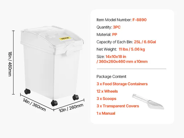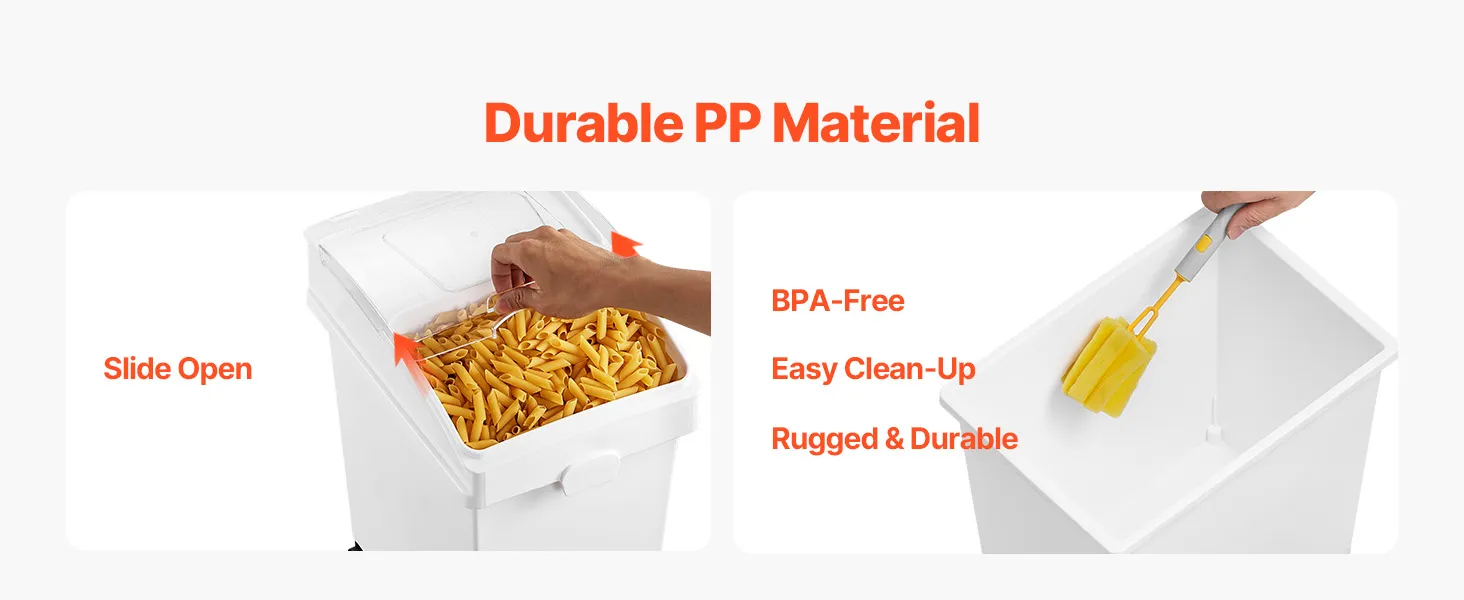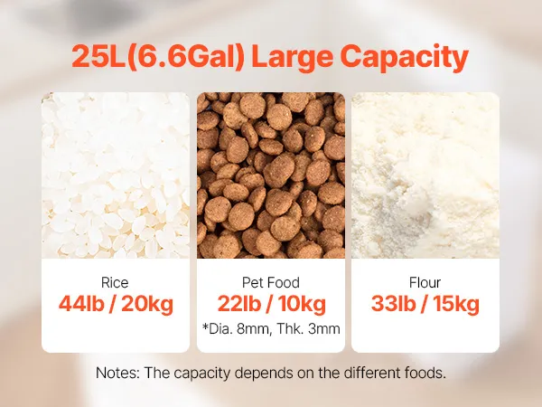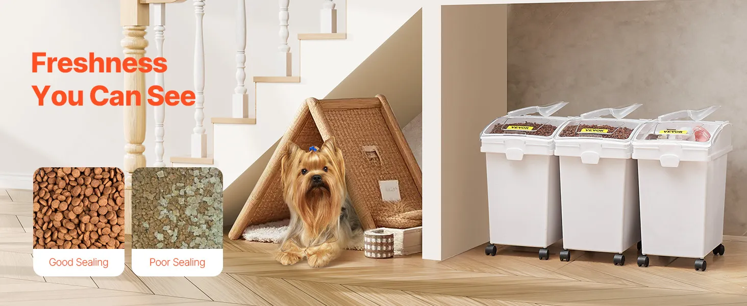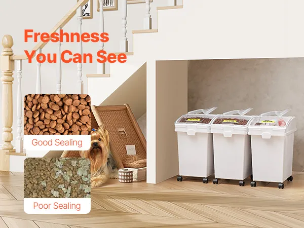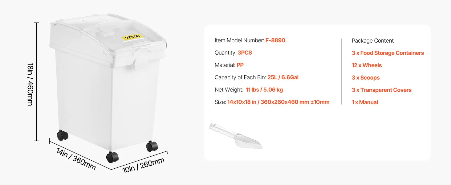 Víceúčelový kontejner: Připravte se na uložení nejrůznějších věcí, včetně krmiva pro psy, pelet, semen, svačin, mouky, rýže, ořechů, luštěnin, obilovin, cukru a dalších. Je dostatečně všestranný pro uložení lidského jídla, kancelářských potřeb, hraček a dalších věcí, které byste mohli mít.