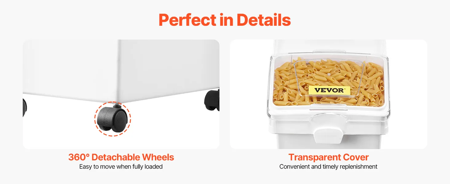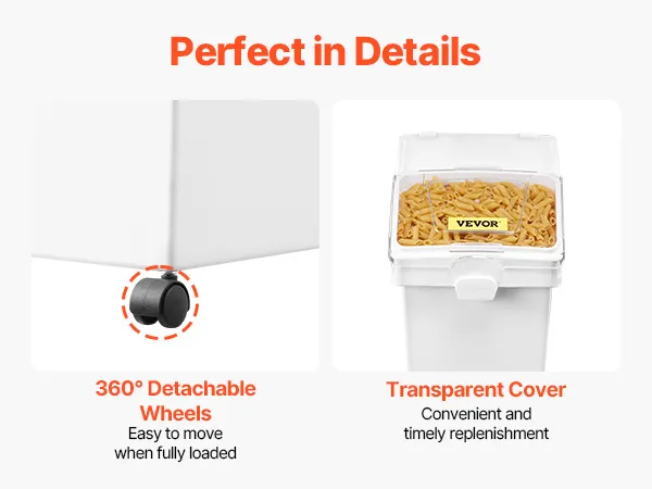 Tato nádoba na krmivo pro domácí mazlíčky je vybavena odnímatelnými kolečky o 360° a zajišťuje snadnou manipulaci, a to i při plném naložení. Ať už přepravujete těžké krmivo pro domácí mazlíčky nebo sypké suché zboží, její přemisťování po kuchyni nebo úložném prostoru je bezproblémové a pohodlné.