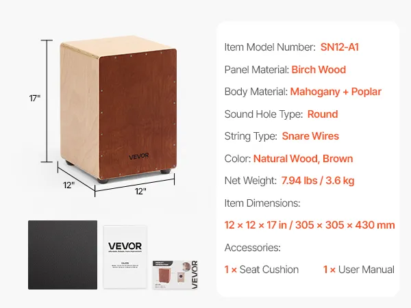 VEVOR Cajon Box Drum, with Internal Snare Wires, Lightweight Wooden Percussion Box, Portable Birch Wood Drum Musical Instrument with Silicone Feet, for Beginners and Professionals, 305 x 305 x 430 mm
