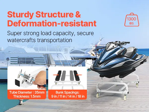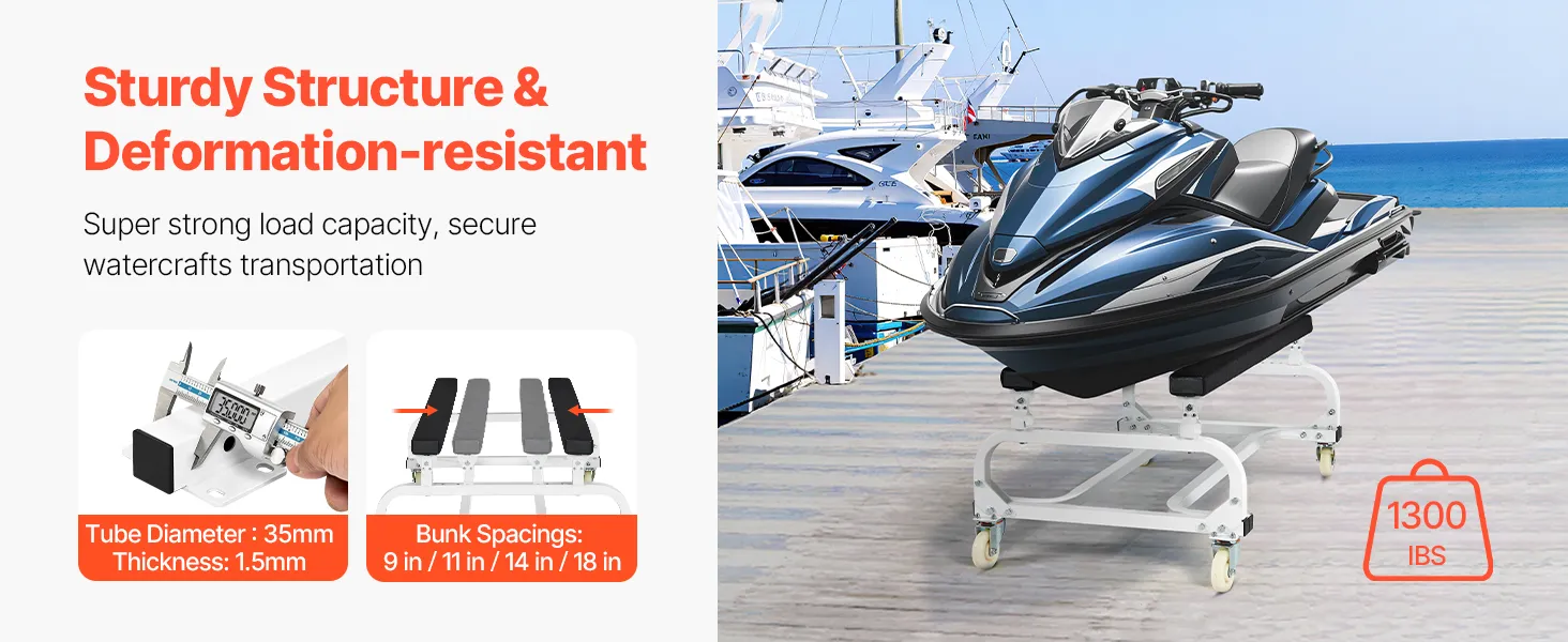 Rozteč i úhel paland je nastavitelný, takže je kompatibilní s různými dny lodí. Vozík na vodní skútr je ideální pro skladování nebo přepravu středních až malých lodí, včetně vodních skútrů, kajaků, nafukovacích člunů a plachetnic. Skvělé pro lodní obchody, které chtějí vystavovat vodní skútry.