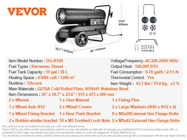VEVOR petrolejový/naftový ohřívač vzduchu, torpédový ohřívač prostoru s výkonem 100 000 Btu, přenosný s termostatem, nádrž 38 l, účinný petrolejový ohřívač pro vnitřní/venkovní použití pro domácnost, staveniště, průmysl, dílny, černý
