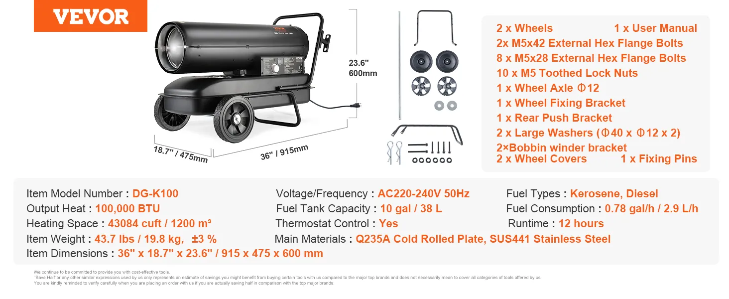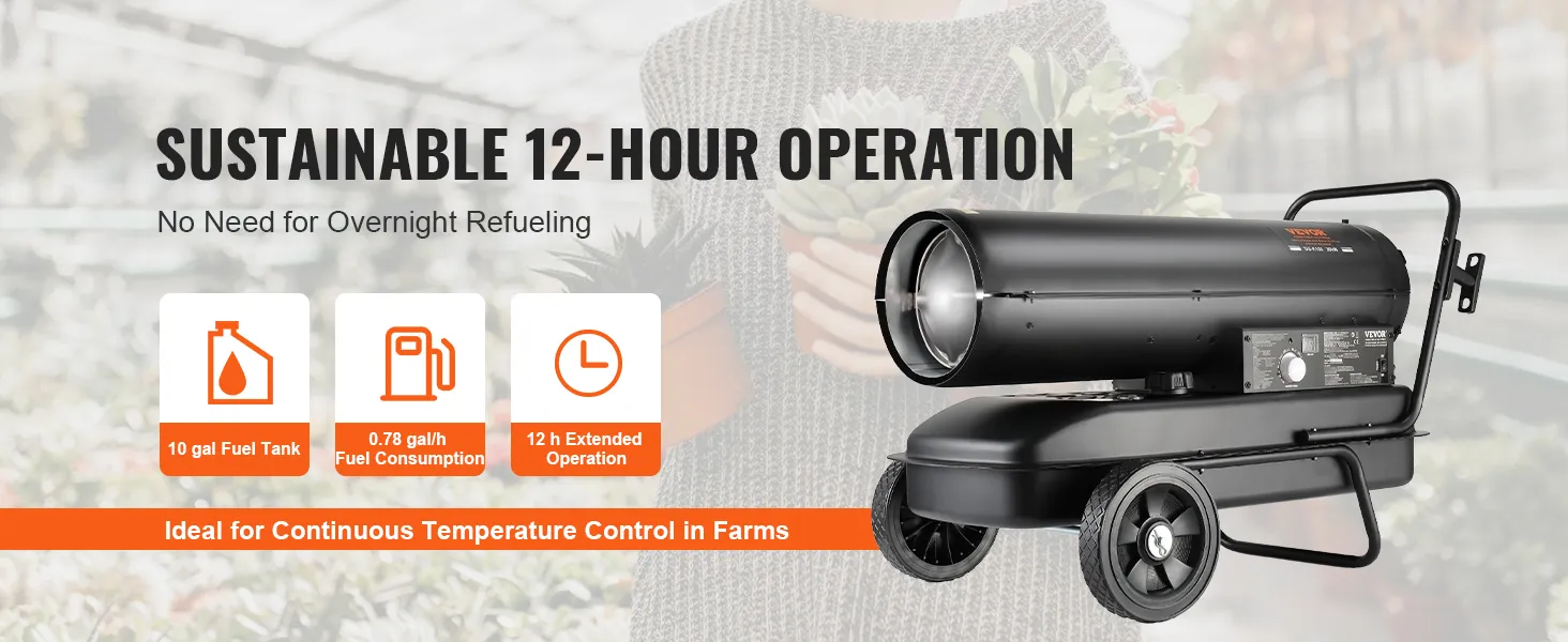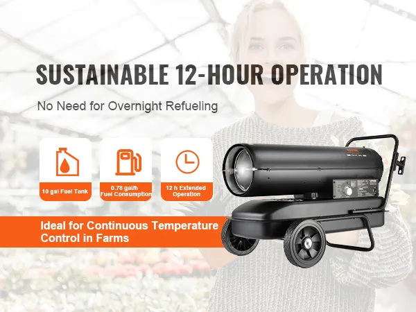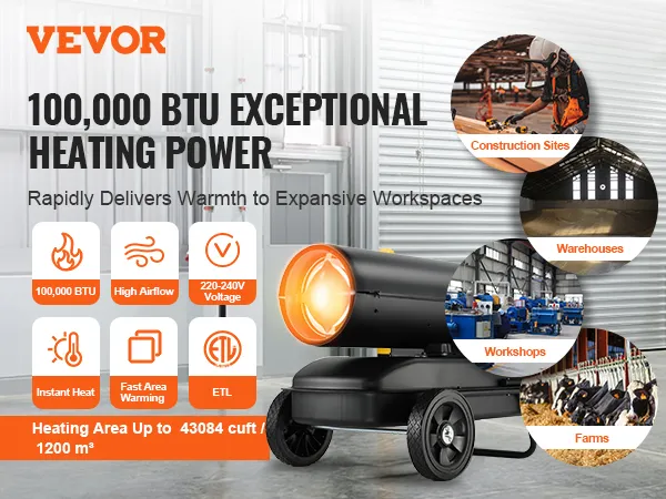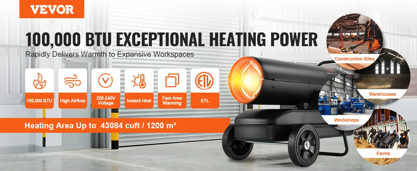 Vytápění pro široký pracovní prostor: Tento petrolejový ohřívač s nuceným oběhem vzduchu dodává 100 000 BTU tepla a okamžitě vyhřeje prostory, jako je pracovní prostor, stodola, dílna, farma nebo vnitřní prostory, až do objemu 1200 m³. Zajišťuje efektivní provoz zařízení a pohodlí pracovníků.