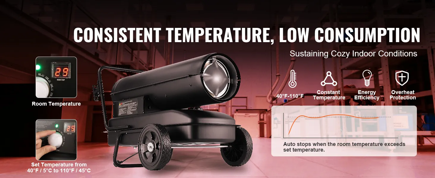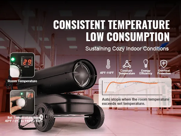 Tento petrolejový ohřívač efektivně vytápí továrny, stodoly a farmy. Teplotu můžete nastavit od 5 °C do 45 °C a po dosažení požadované teploty se ohřívač zastaví, čímž šetří energii.