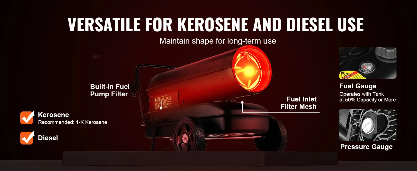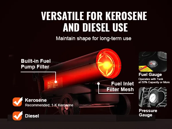 Toto topení, které podporuje jak petrolej, tak naftu, nabízí flexibilitu použití. Používejte vždy jen jeden typ paliva. Automaticky se vypne při nízké hladině paliva a je vybaveno ukazatelem paliva a dvojitou filtrací paliva pro čistší provoz.