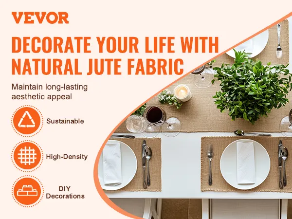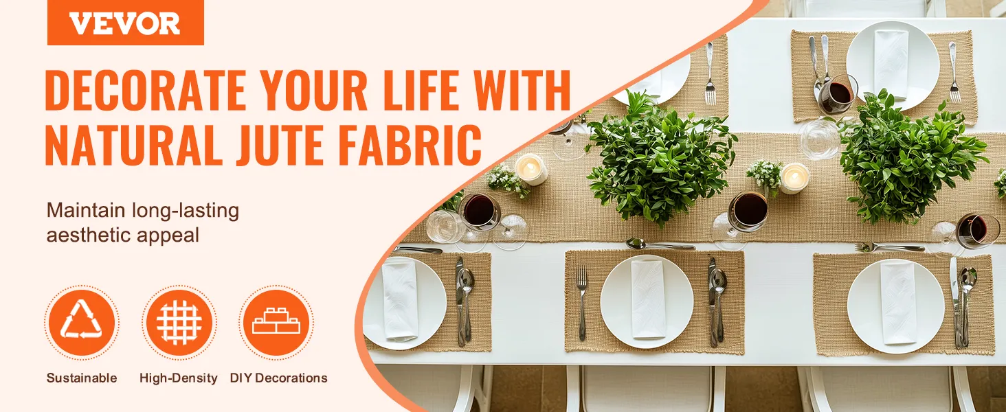 Teplé tóny a přírodní vzhled tohoto jutového materiálu z něj činí ideální místo pro večeře, svatby, oslavy narození dítěte a narozeniny. Doplní každou kuchyň nebo jídelnu, aniž by rušila ostatní, a nabídne útulnou a příjemnou atmosféru.