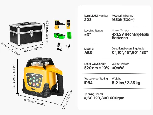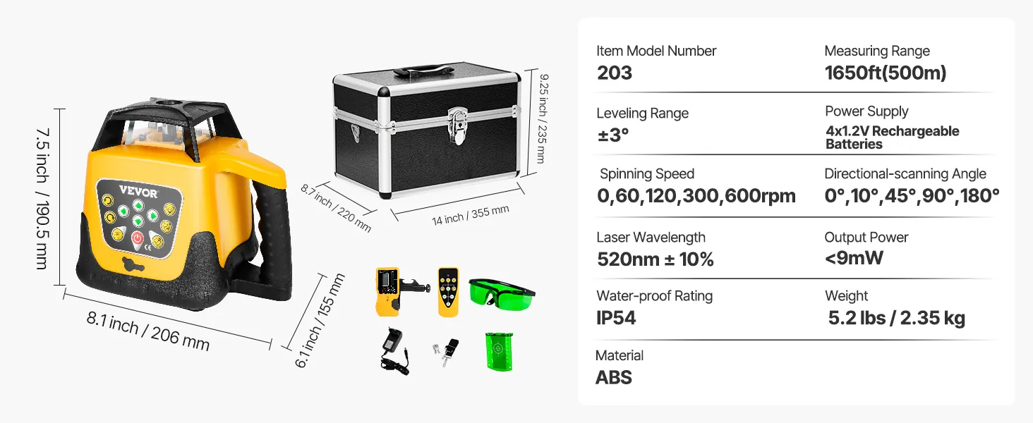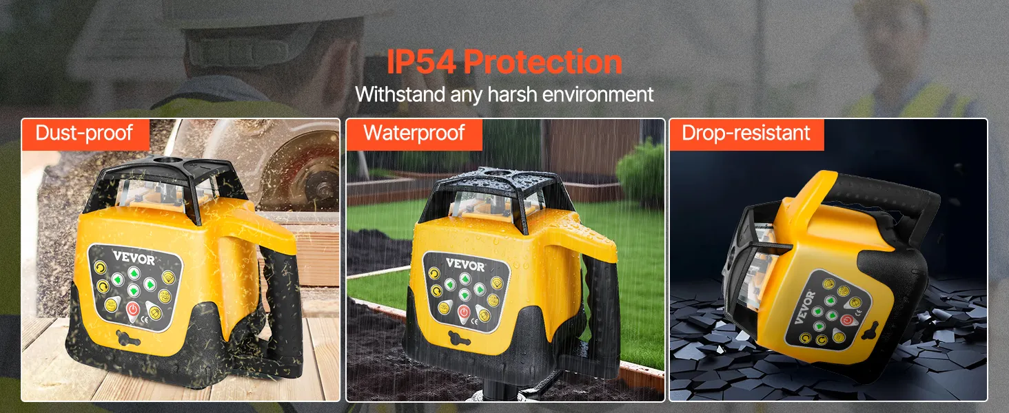 Sturdy Protection: Built with sturdy plastic and high-quality metal, this rotary laser level kit is rugged and reliable. IP54 dustproof and waterproof design withstands dirt and damp, ensuring stable operation even in harsh conditions