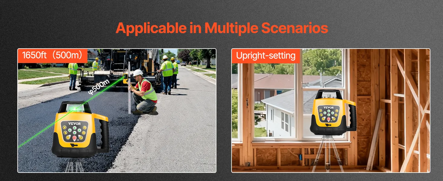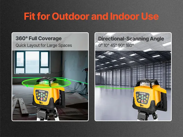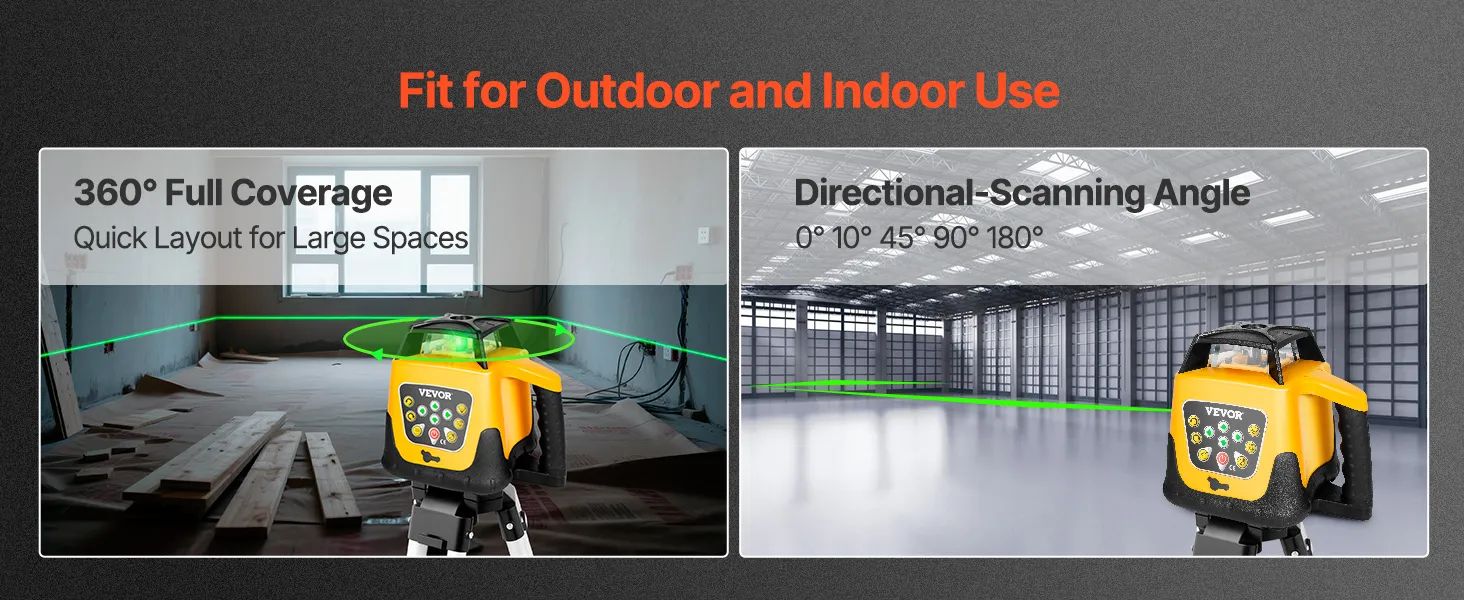 Indoor & Outdoor Use: Versatile for layout, wood installation, truss/joist construction, shelving, and wall layouts. Covers common construction and home renovation tasks with this rotary laser level