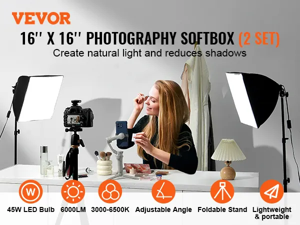 Naše sada osvětlení pro fotografický softbox o rozměrech 16" x 16" s 45W LED světlem a jasem 6000LM. Podporuje nastavení úhlu, vhodné pro všechny druhy fotografických potřeb. Skládací stojan se snadno přenáší a skladuje, ideální pro profesionální fotografování a video produkci.