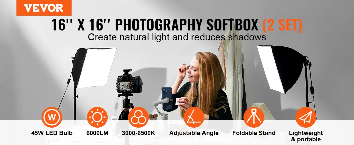 Měkký a rovnoměrný paprsek: Sada softboxů o rozměrech 16'' x 16'' s energeticky úspornými LED diodami o výkonu 45 W a vysokým jasem 6000 LM. Vícevrstvé reflexní vrstvy účinně změkčují světlo a poskytují široké rozložení osvětlení s rovnoměrnějším světlem. Odstraňují také stíny, umožňují jasné vykreslení detailů a poskytují lepší zážitek z fotografování, díky čemuž jsou vaše snímky přirozenější a živější.