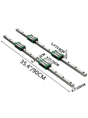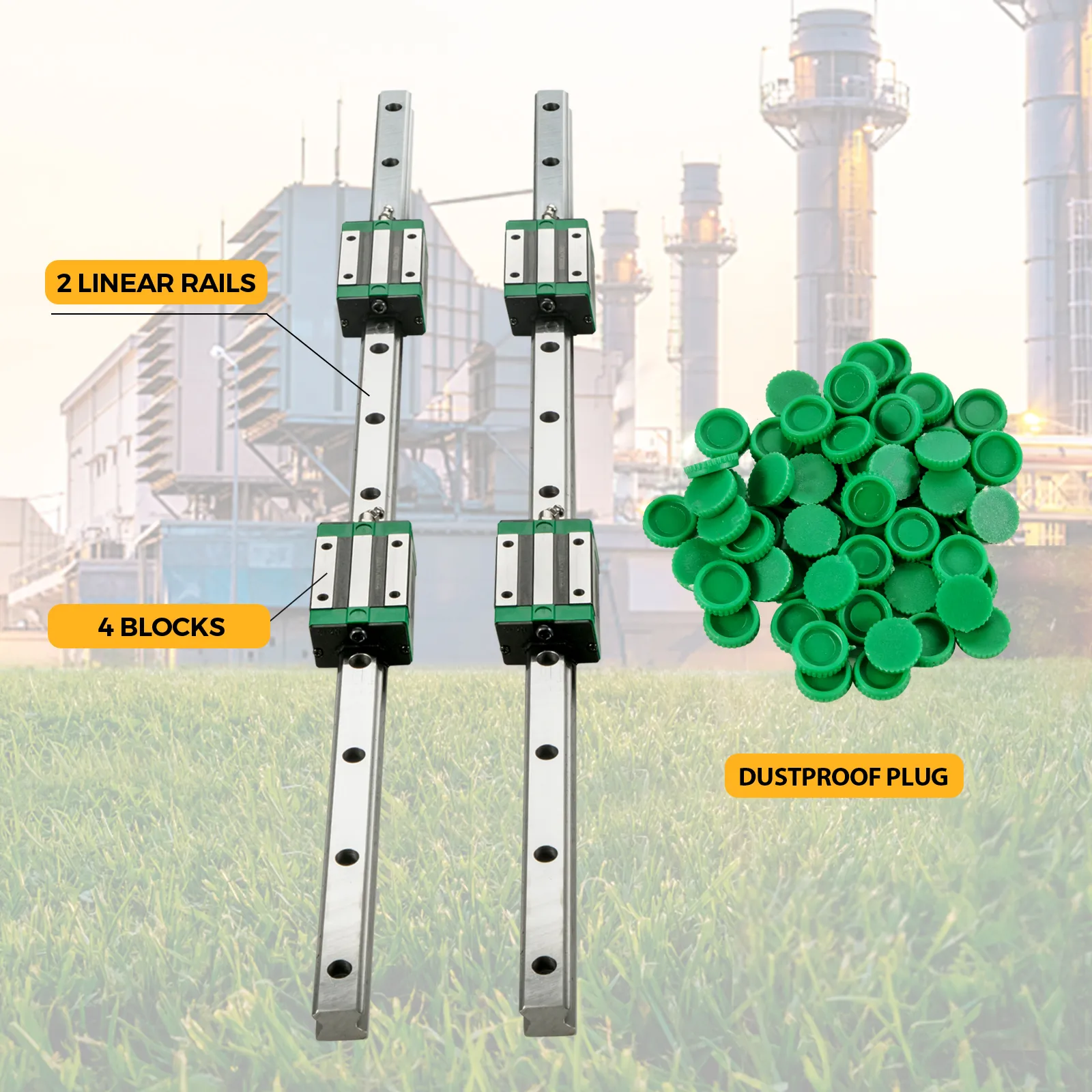 The linear guide and bearings kit contains 2 pieces of 35.4"/900 mm long HSR20 rail shaft, 4 HSR20 blocks, and a bunch of dustproof plugs.