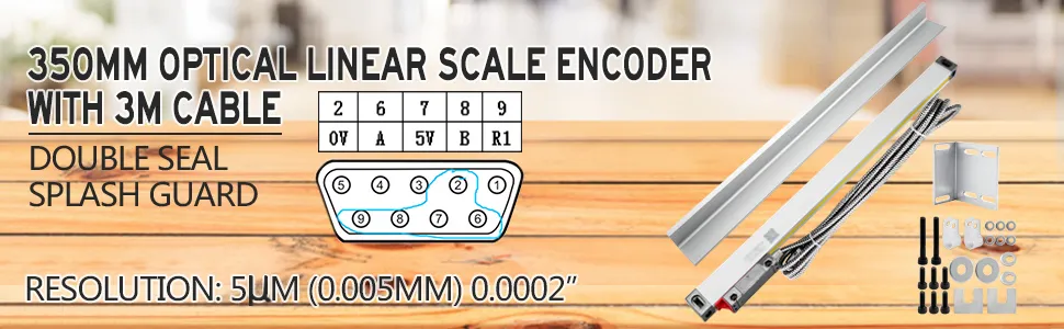 Lineární stupnice aplikuje inteligentní čip s délkou dráhy 0-350mm, vysokou přesností 5um, roztečí mřížky: 0,02mm, rychlostí odezvy: 60m/min. Konektor: 9pinový konektor (Pin-26789), 2 až 0 V, 6 až A, 7 až 5 V, 8 až B, 9 až R1.