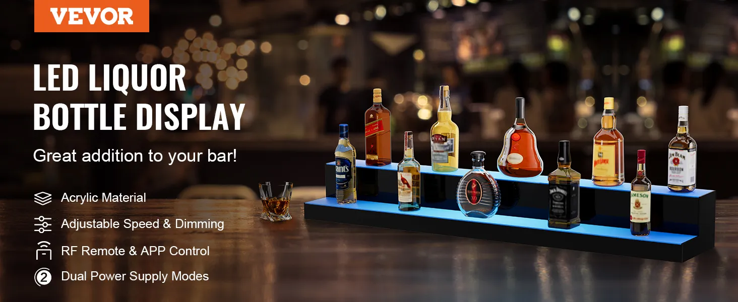 Power up and Keep the Party Going: No matter where the party is, our lighted liquor bottle shelf never run out of power. They can be powered by a 110-240V power adapter and a laptop/power bank. Let the party live on! Due to two power supply methods, our product can satisfy indoor and outdoor activities. Charge up, party, and live it up till the sun comes up.