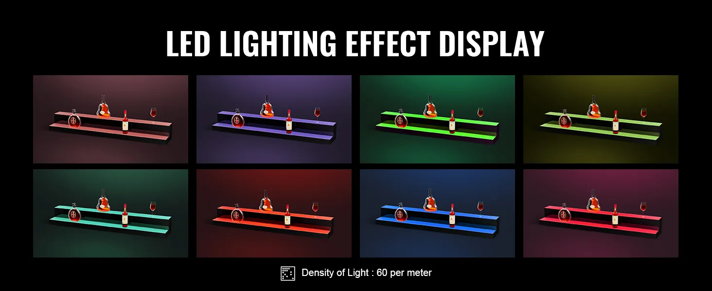 Spotlight your Bar: Prepare to be dazzled by an upgraded LED light effect and leave your guest speechless. 60 lamp beads per meter is sure to create a night to remember. Given the superb lighting performance, it is no surprise that our led lighted bar shelf display can create a brighter ambiance for any bar.