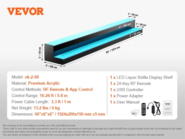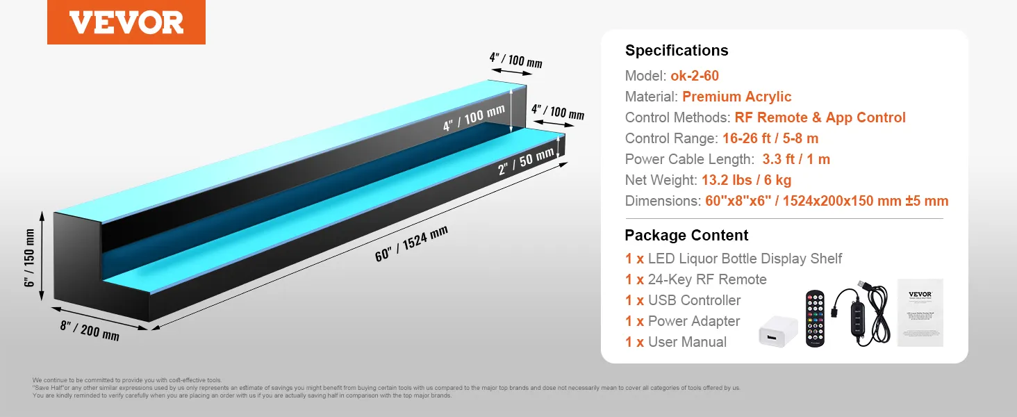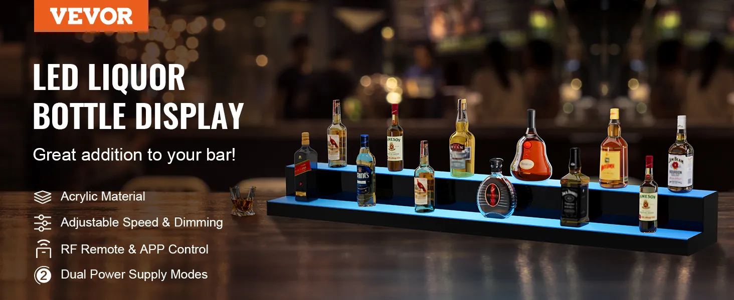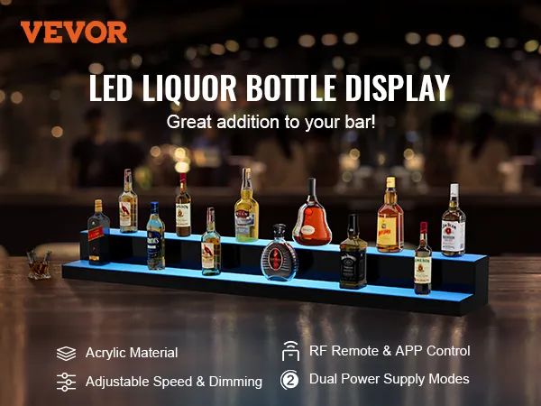 VEVOR LED Lighted Liquor Bottle Display, 2 Tiers 60 Inch Commercial Illuminated Home Bar Shelf, 2 Steps Whiskey Rack Stand, Acrylic Drink Shelves with RF Remote & App Control, and Multicolor lighting VEVOR LED Lighted Liquor Bottle Display, 2 Tiers 60 Inch Commercial Illuminated Home Bar Shelf, 2 Steps Whiskey Rack Stand, Acrylic Drink Shelves with RF Remote & App Control, and Multicolor lighting