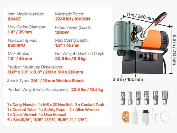 Efficient Drilling Power: This 1300W mag drill press provides efficient performance. With a maximum core drilling diameter of 1.4" / 35 mm and depth of 1.8" / 45 mm, it easily handles large-diameter, deep-hole drilling tasks with speed and precision
