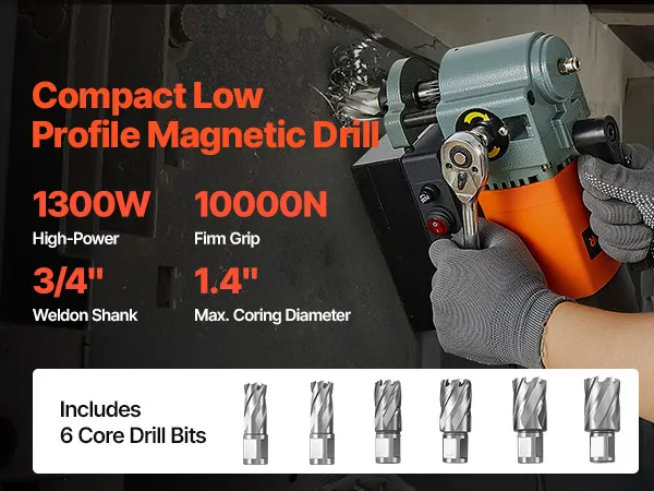 VEVOR Low Profile Magnetic Drill Press, 1300 W, 35 mm Boring Diameter, 10000N Power Portable Mag Drill Press, 650RPM Speed, with Weldon Shank, for Metal Surface, Industrial and Home Improvement