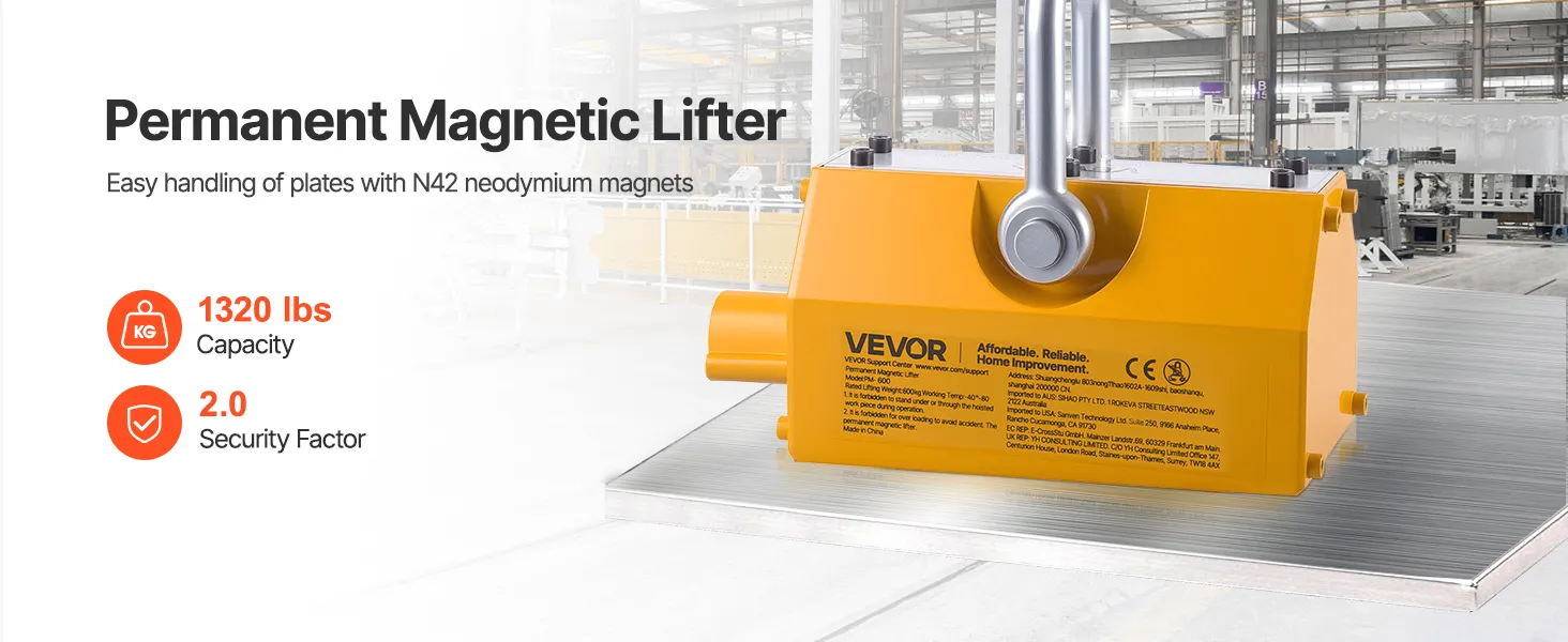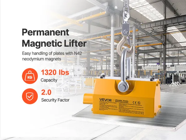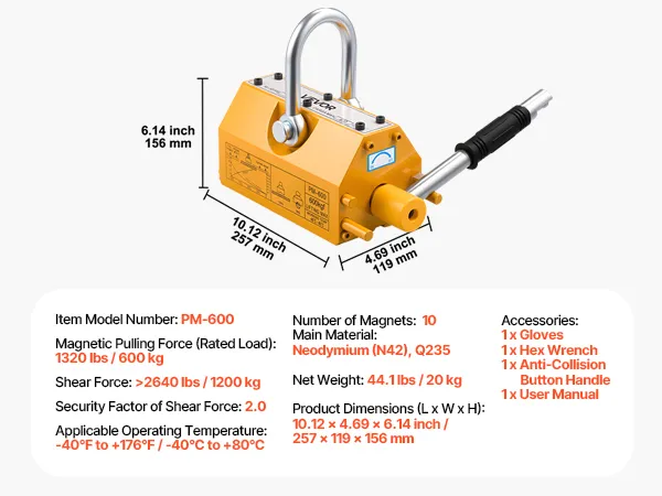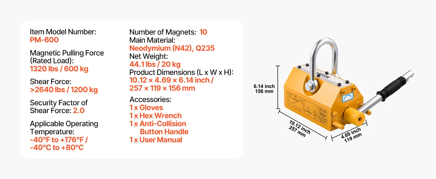 Powerful Magnetic Force: The permanent magnetic lifter delivers up to 1320 lbs / 600 kg of magnetic force with a 2.0 security factor. It features a high-grade N42 neodymium magnet for stable, powerful lifting performance