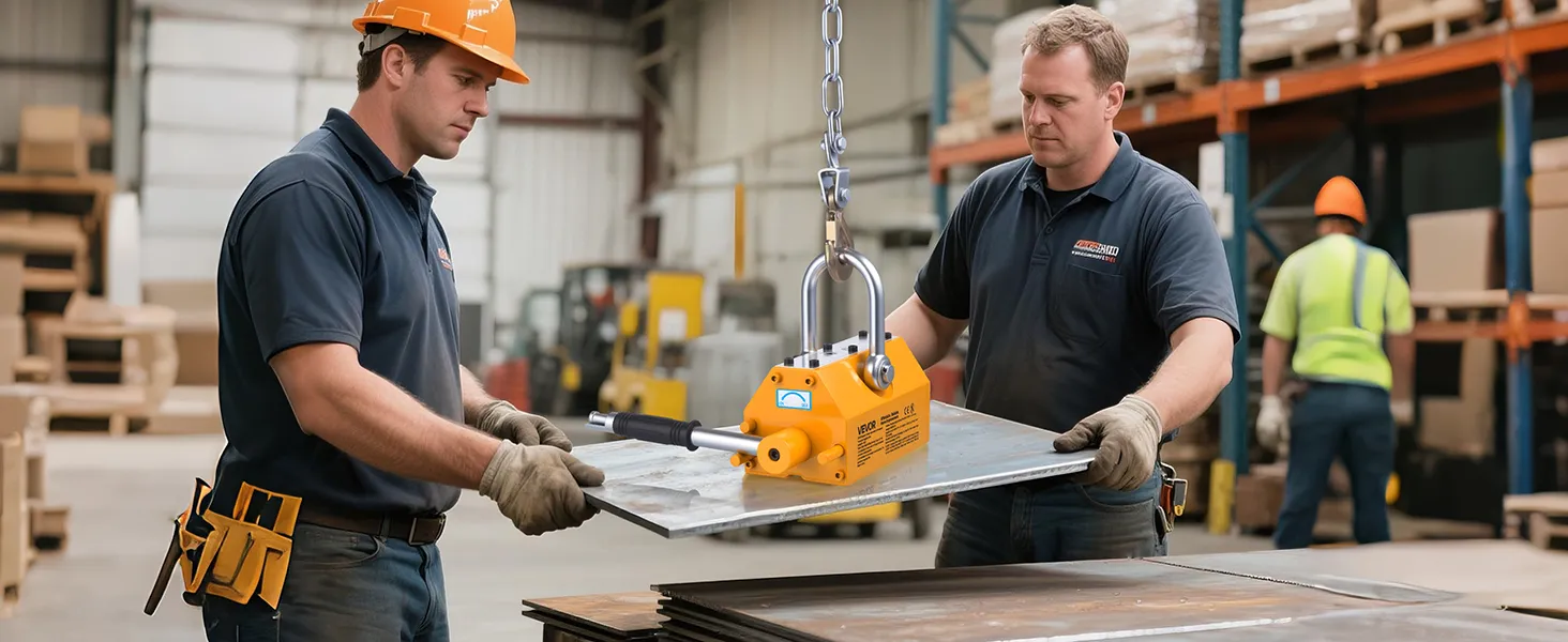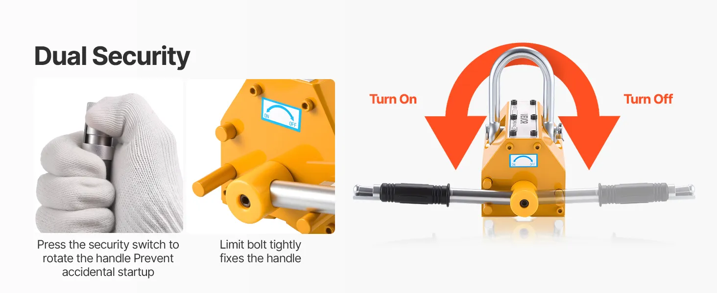 Flexible Switch: The lever-style shaft design of the hoist magnet makes switching easier—turn left to engage the magnet, turn right to release. The built-in lock pin keeps the handle securely in place.