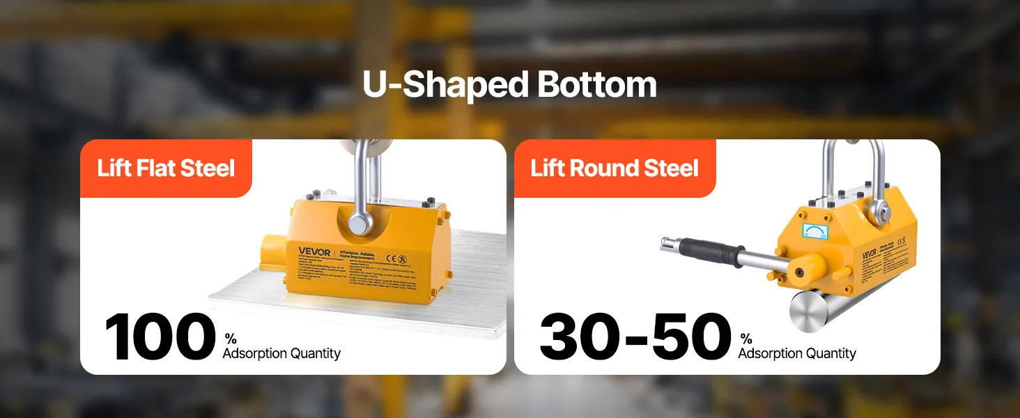 U-Shaped Base: The U-shaped bottom is designed to lift flat sheets and round steel, expanding its range of use. The magnet for hoist is ideal for lifting steel plates, rods, blocks, and pipes in the power, mining, transport, and engineering fields