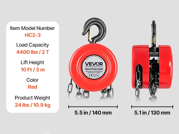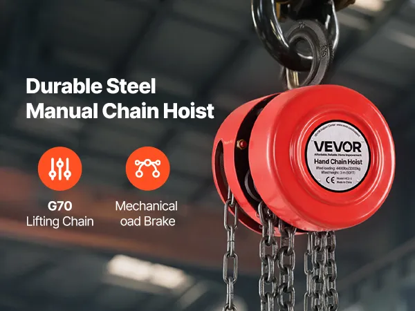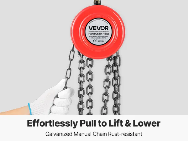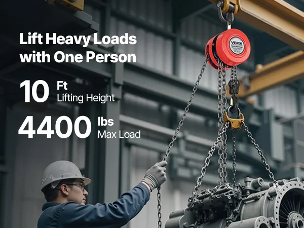 4400 lbs Heavy Duty Capacity: This hand chain hoist easily handles heavy lifting tasks, supporting up to 4400 lbs (2 T) and reaching heights up to 10 ft (3 m). Ideal for garages, construction sites, and warehouses