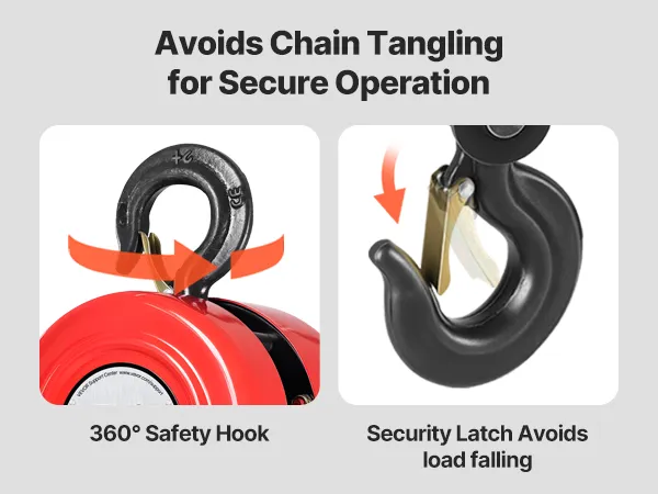 360° Rotating Hooks: Both hooks rotate 360° for easy, flexible positioning. The security lock of the manual chain fall ensures secure usage, and the adjustable lifting angle keeps the chain tangle-free and your work efficient