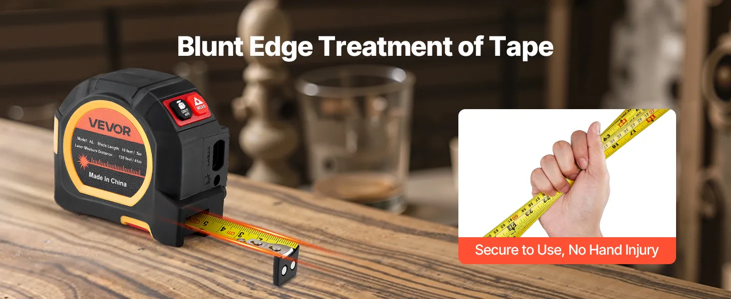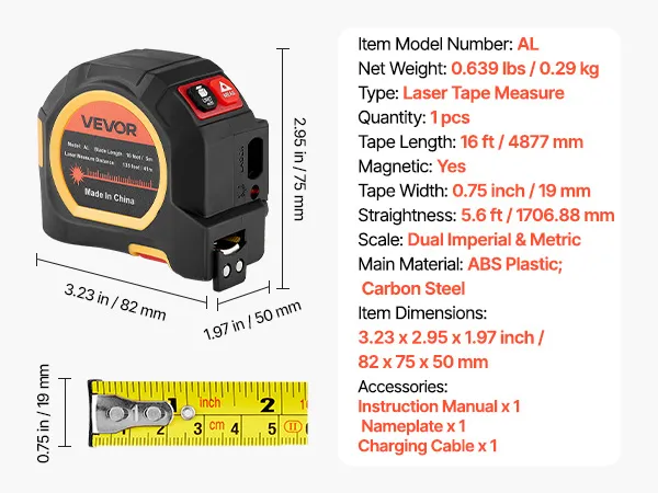 This tape measure is designed for home and work use, featuring a dual imperial and metric scale for easy unit switching. The ABS impact-resistant case and 55# carbon steel rust-resistant tape ensure durability, while the passivated tape edge reduces the risk of cuts.