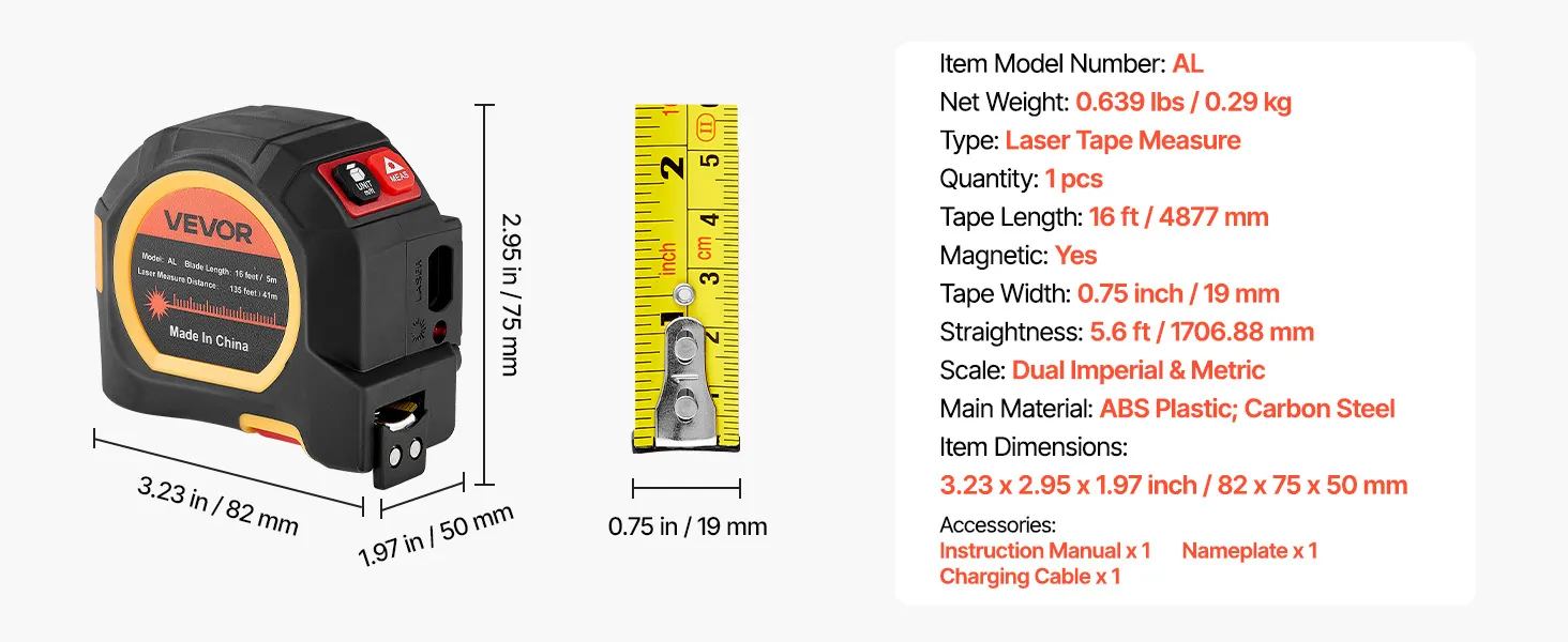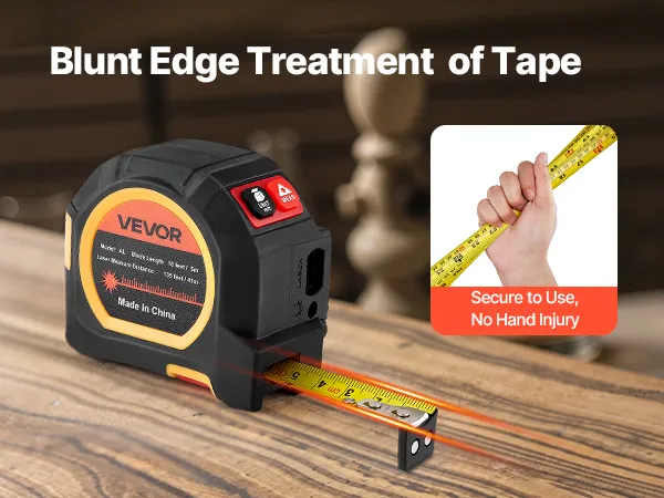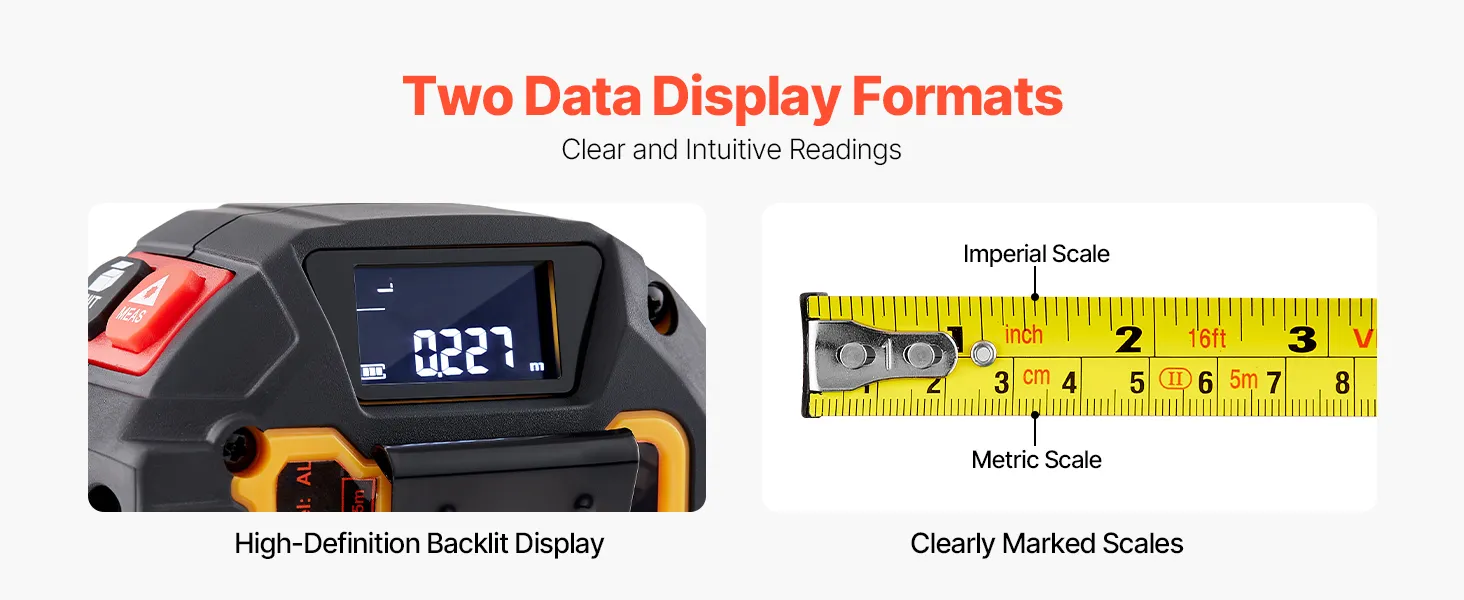 Imperial & Metric Dual Scale: Clearly marked with both imperial and metric scales, and laser measure supports four units (metric, feet, inches, feet + inches), seamlessly switching between North American and international standards for easy operation by engineers and DIY users