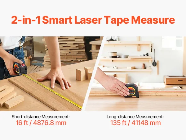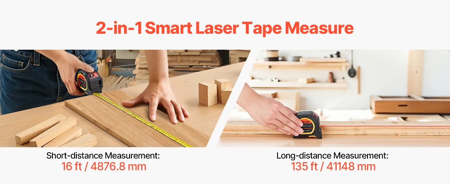 Dual Mode Integration: Combines a 16 ft / 4876.8 mm mechanical measuring tape and a 135 ft / 41148 mm laser distance measure, with four modes (length, area, volume, continuous scan), ideal for both narrow spaces and large-scale outdoor measurements