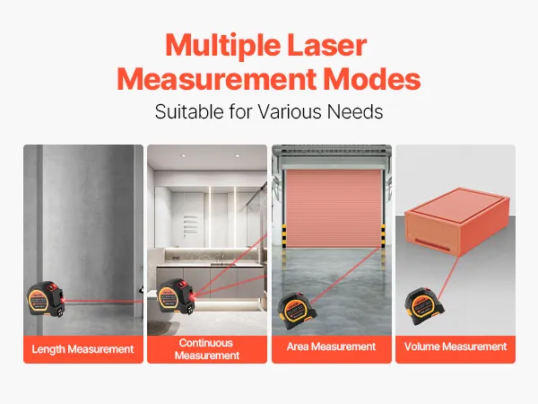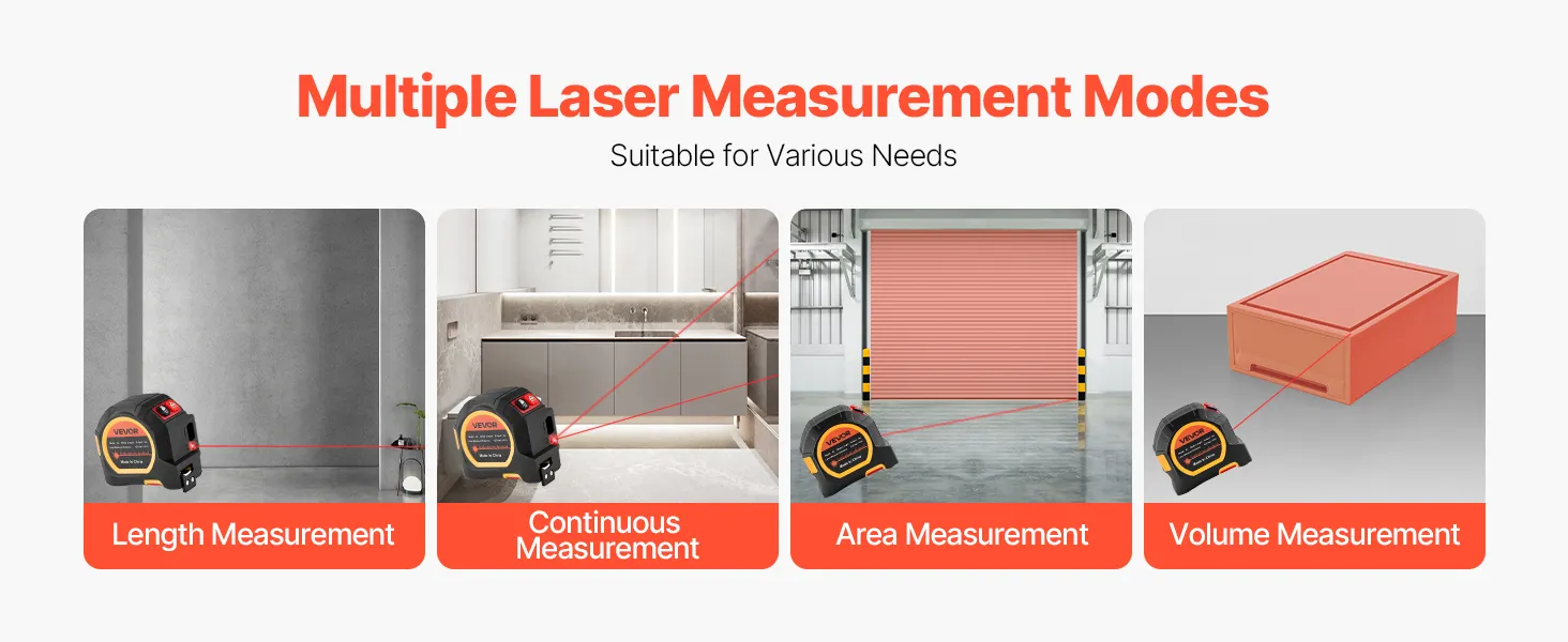 The laser distance measuring function includes length, continuous, area, and volume measurement modes, offering flexibility to switch between different modes, adapting to your various measuring needs.