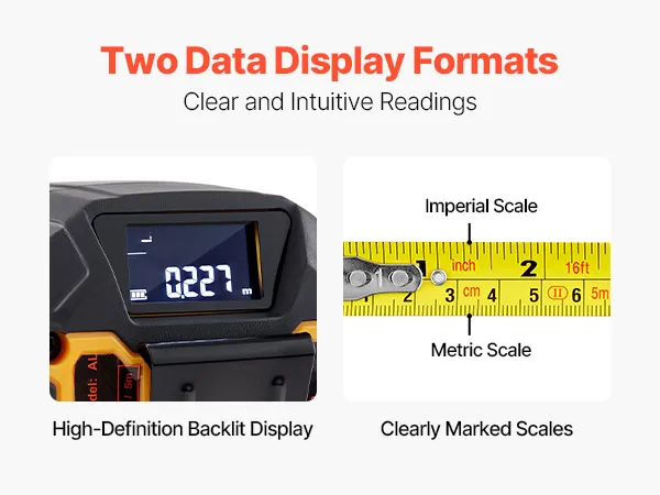 This tape measure provides two clear data display options: a tape with marked imperial and metric scales, and a high-definition backlit digital screen that shows measurements directly.