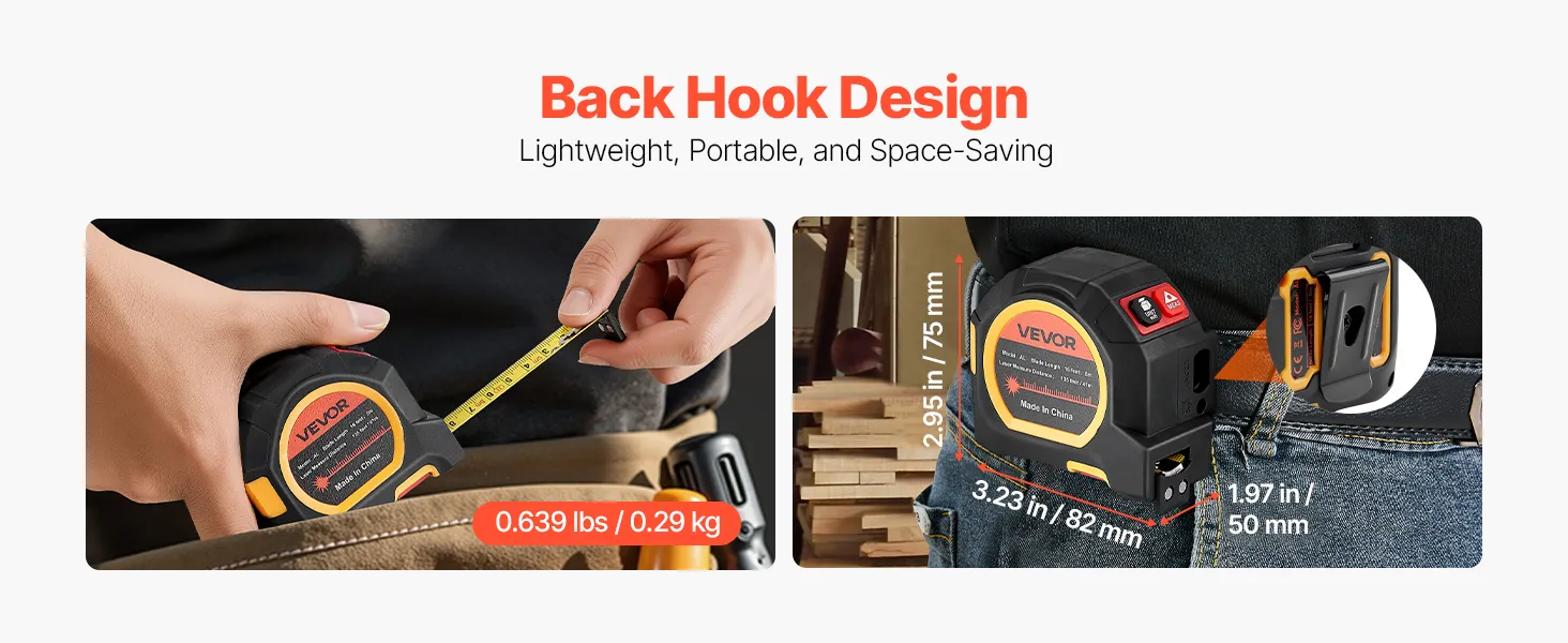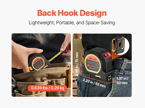 Designed with portability in mind, this tape measure is lightweight and easy to carry. It also features a hook on the back for convenient attachment to your tool bag or clothing.